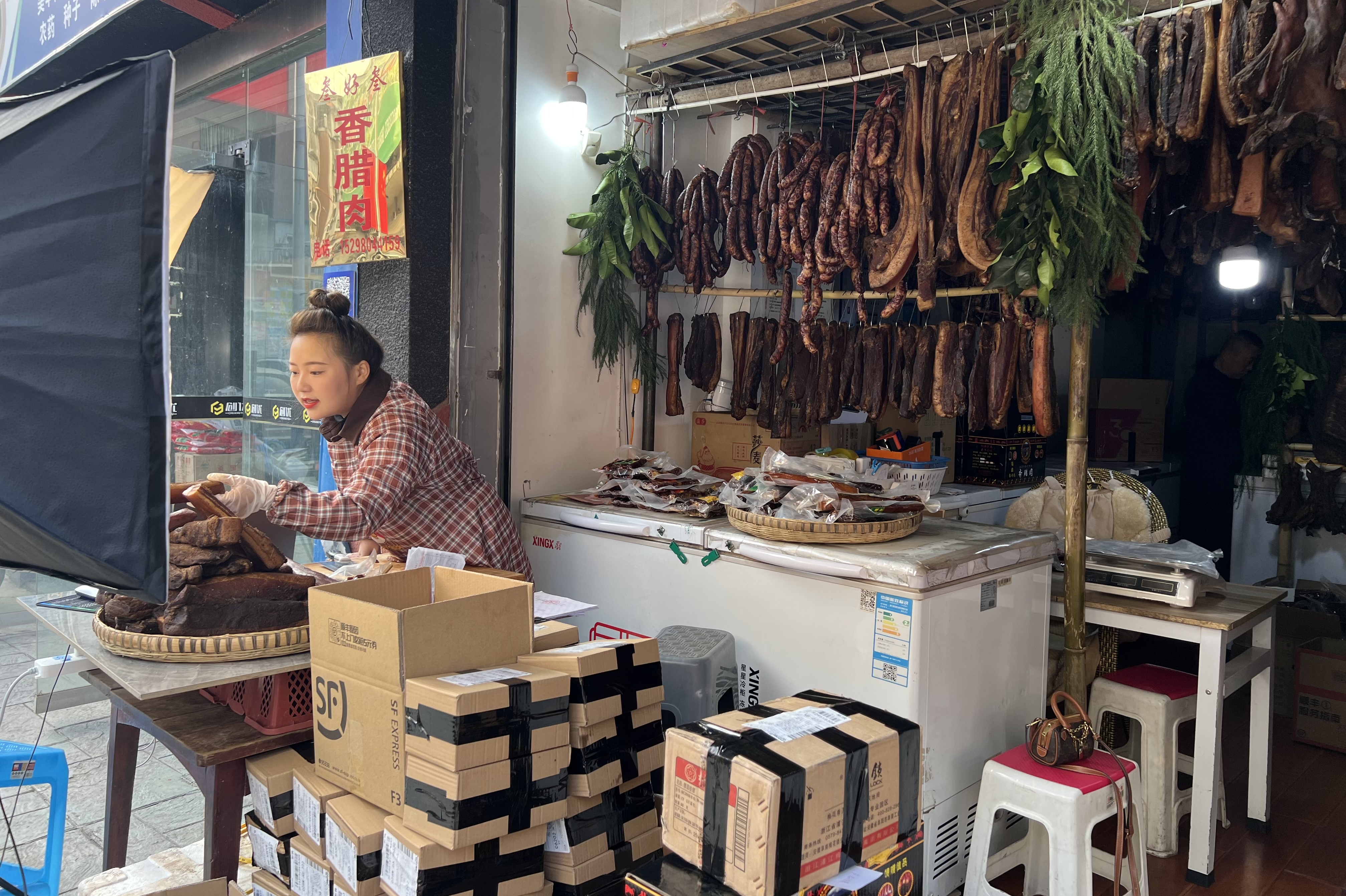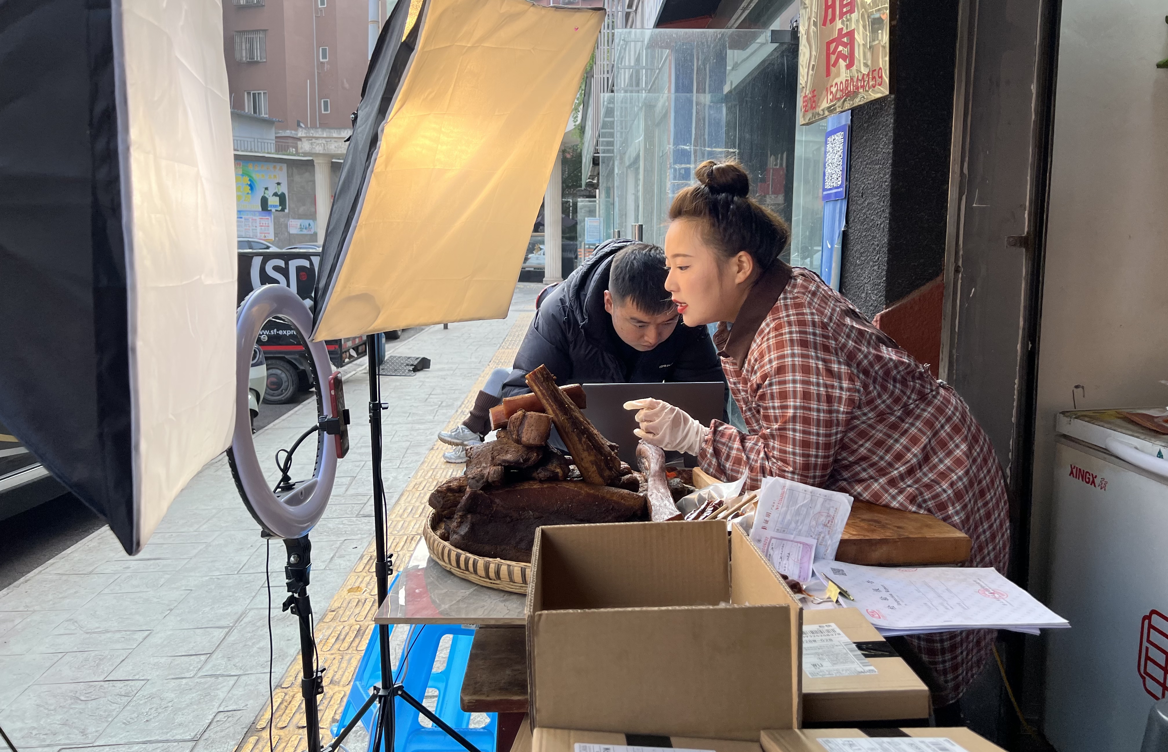 “今天是主播第一天开播,我们家的腌腊制品都是来自小凉山马边的粮食土猪肉......”12月14日上午,在马边彝族自治县城区三好商行,29岁的宋秋旭在店门口给自家腌腊制品做直播带货。从腊肉的食材到制作方式,再到口感价格,并附上腌腊制品质量检测报告,直播间里,宋秋旭详细介绍产品。